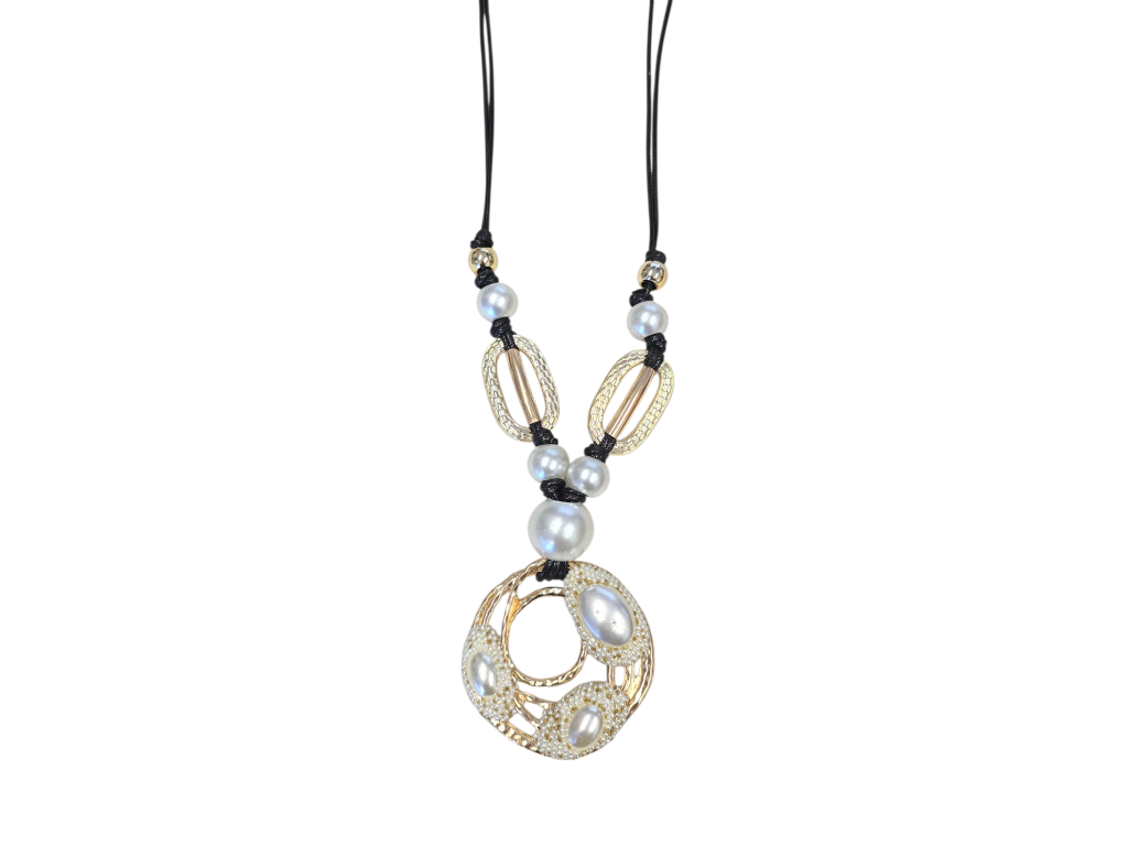Materiál: bižuterní kov, textilní provázek, syntetické perly
