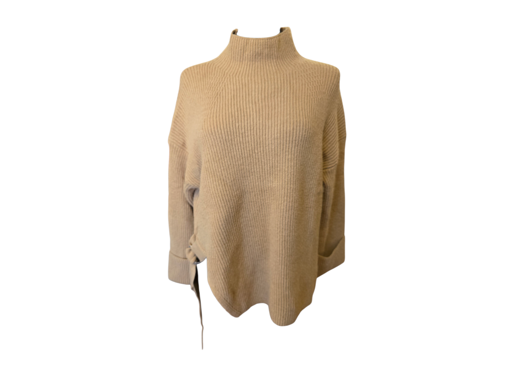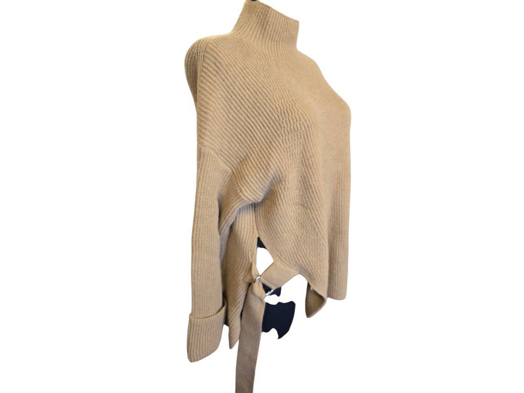 Svetr vyniká svým nepřehlédnutelným asymetrickým střihem. Zatímco levá strana má standardní délku rukávu a spodního lemu, pravá strana je rafinovaně střižena kratší, aby odhalila pas, a je zakončena stylovým páskem s kovovou přezkou. Tento detail nejenže krásně definuje pas, ale dodává svetru moderní, až architektonický vzhled.